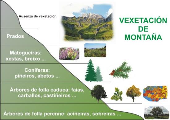 - 1º nivel.Pé da montaña: árbores de folla perenne (aciñeiras, sobreiras)