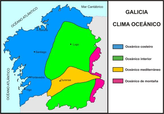 - Temperaturas suaves todo o ano: inverno (±10ºC) , verán (±20ºC). Aumentan cara ao Sur (Vigo) e ao interior( Ourense, Lugo) no verán , e disminúen no inverno cara ao Norte ( A Coruña, Lugo ) e ao interior (Ourense, Lugo).
