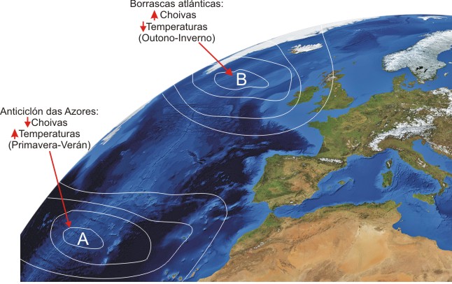 o Anticiclón subtropical das Azores: Atraen masas de aire tropical, aportando tempo estable e seco con aumento de temperaturas, sobre todo na primavera e no verán.